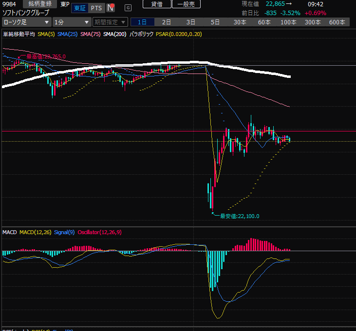 あと、現在持ち越しているのは東京エレクトロンとソフトバンク。9984 ソフトバンクは前日比3.5%。MACDが上向きはじめたらプラ転するのでこのまま放置。