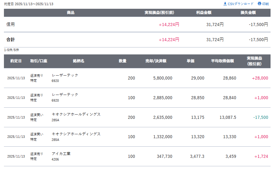 レーザテック、10時頃に約定通知が入りました。昨日仕込んだアイカ工業は思ったほど戻さなかったので利益確定。