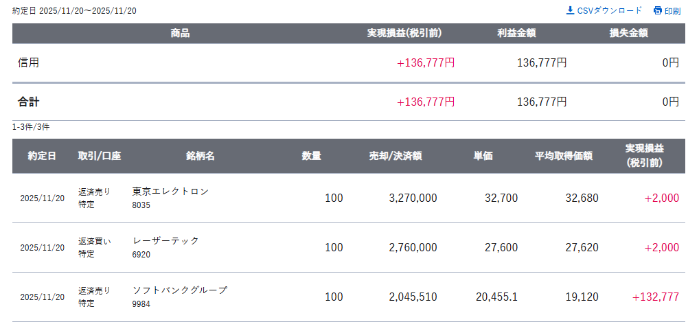 お疲れ様です。前場に仕込んだ東京エレクトロンを前引け成売りして利益確定。ソフトバンクグループを半年で買いました。
