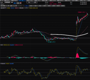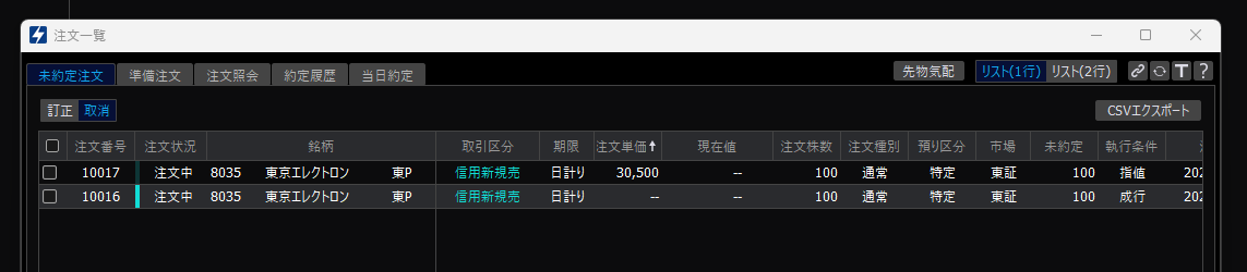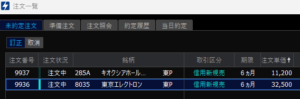 それに伴い、半導体関連株が下落からスタート。朝、寝坊して着席が遅れて指値だけ入れてバタバタ。