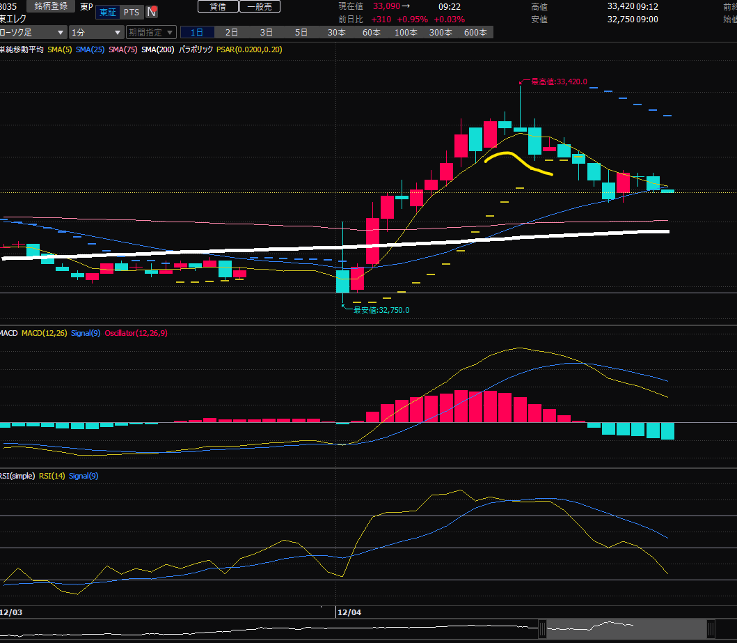 8035 東京エレクトロンをショートで入りました。33,420円最高値は一瞬でした。上に入れようかなと思いましたが、踏み上げられたら1日信用だし取り返すのに間に合わないのでやめました。