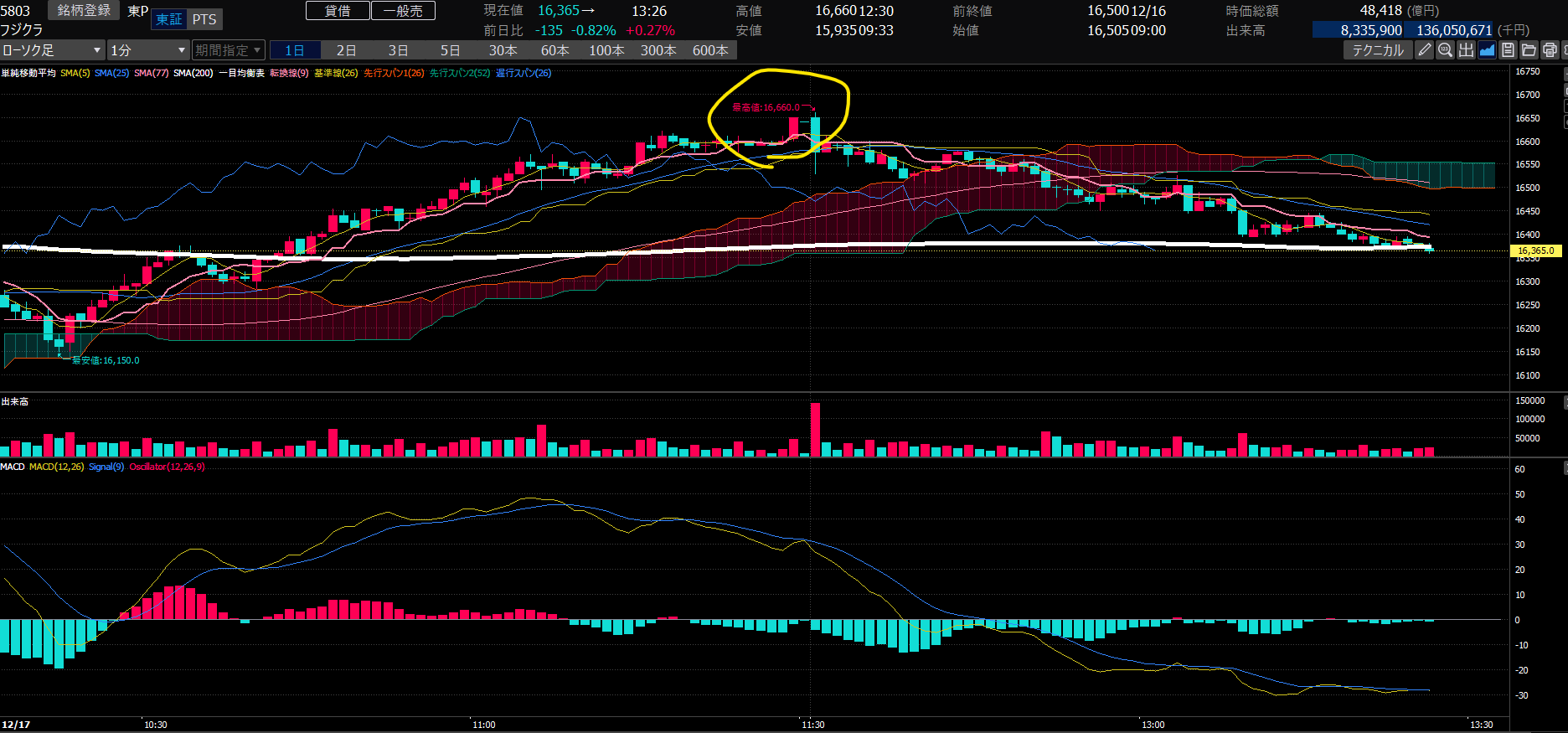欲が出て、『分で取りに行こう』とフジクラ。ロットを上げて400で入ったらズドドと下落。(あるある)スキャ目線で入ったものの、どんくさくて即座に手が動かず。