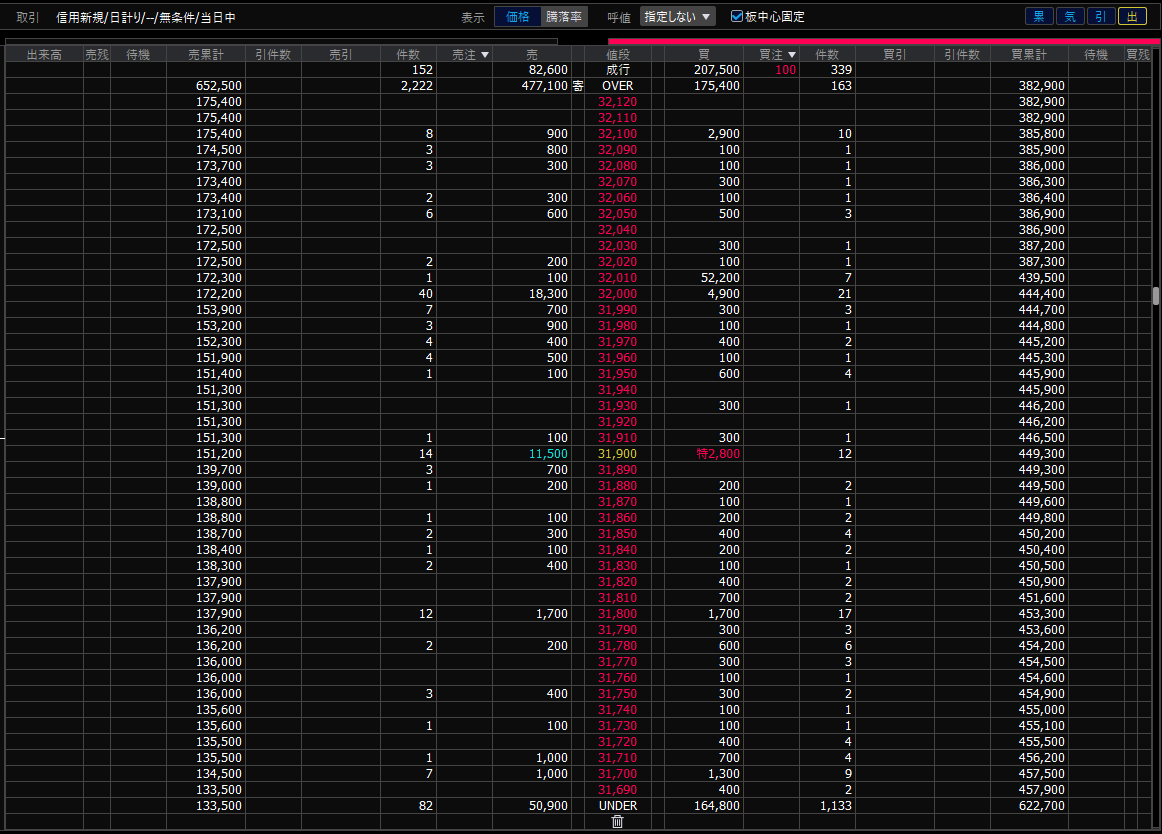 100しか入らないとすると、最高値で売り抜けることができたとて5千円程度しか取れませんよね。ボチボチ・コツコツトレードの私は、やはり成行買は向いていないなと思います。