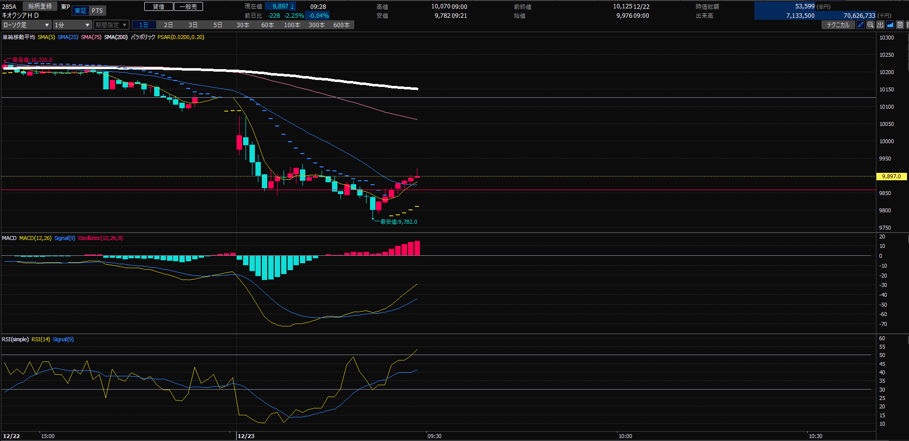 おはようございます。時間軸長めにスィング目線で東京エレクトロンとキオクシアに入りました。思ったより高値をつかんでしまい、ぎりプラ転で利益確定。
