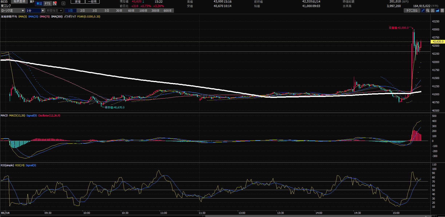 東京エレクトロン、一気に吹き上げ!あれよあれよという間に利益が20万円を超えた。どどど、どうしよ。利益確定すべきか明日に持ち越すべきか?