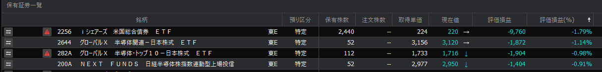 半導体関連ETFを買い増ししました。先週末に買ったばかりなのでマイナスですね。