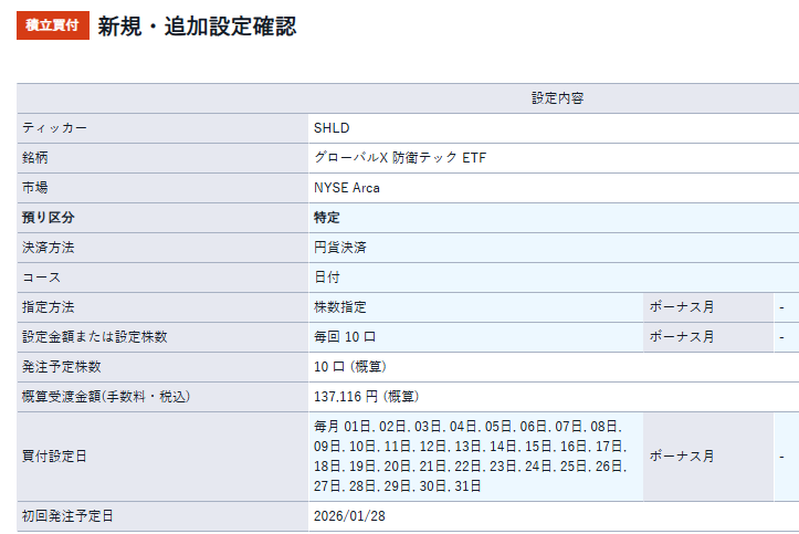 グローバルX防衛テックETFの毎日積立を設定しました。円高傾向なので円貨決済にしておきました。保有ドルの平均単価のほうが安くなれば外貨にすればいいよね?(しらんけど)