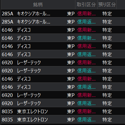 即座に損切り。東京エレクトロンのショートで取ったり、キオクシアのロングで取ったり、10時まで粘ってなんとかプラス着地に持っていくことができました。