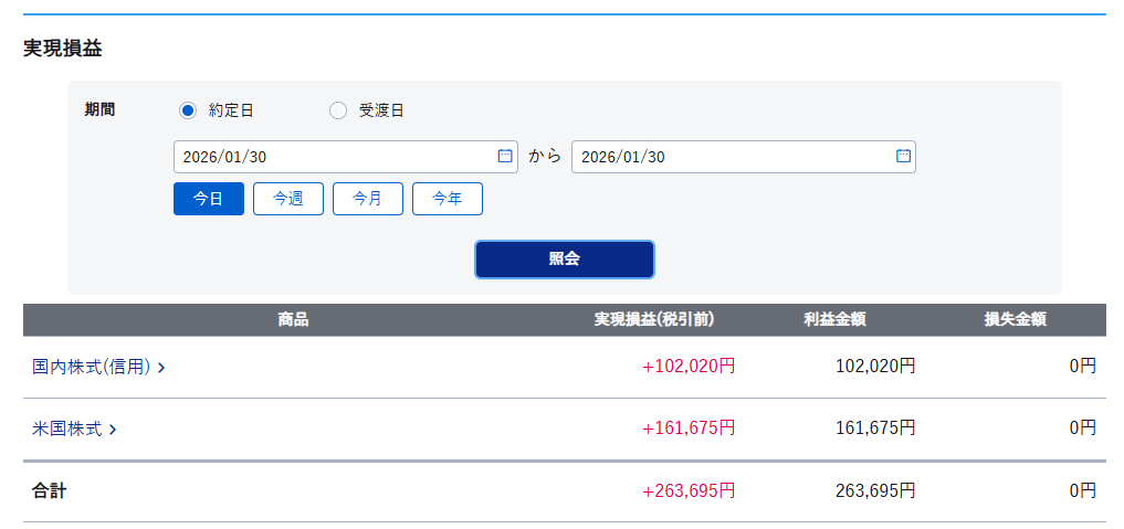 本日の実益:+102,020(信用)+GLD売却益 計263,695円
