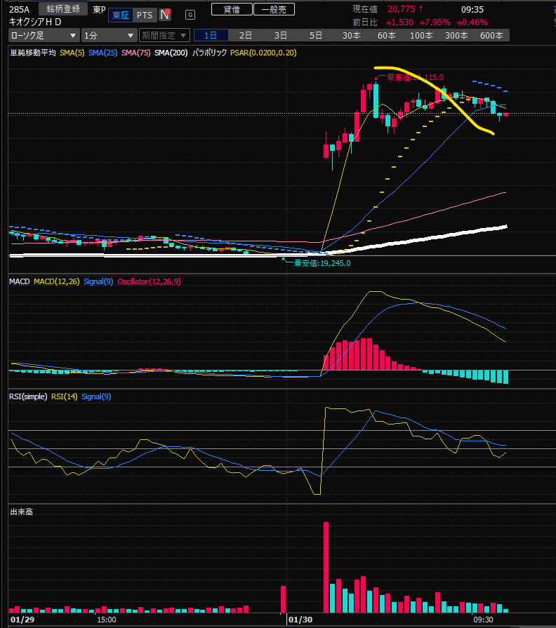 は?キオクシアをショートで??と言われましたが、はい、ショートで取りました。どんどん踏みあがりましたが、歩み値を確認しながら、『ここまで絶対下がる』と思ってナンピンしました。