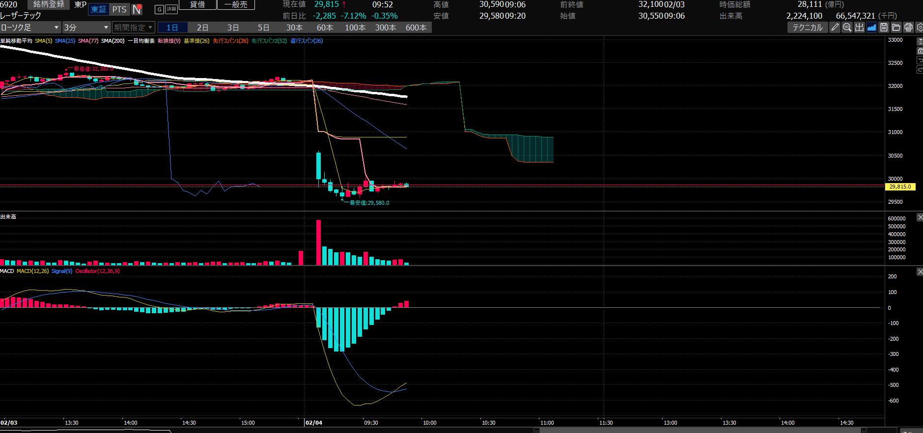 6920レーザーテックを仕込んで離席しようと思います。日足は悪いので、今日~明日の寄り付きにかけてのスィング目線です。指値いれておきます。31,000円くらいかな(適当)3万円ラインをレンジでずくずくして、10時半くらいから戻してきて、200SMA付近まであがったところで金もらが利益確定して日経平均は後場から下がる~みたいな(しらんけど)