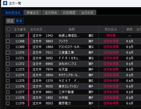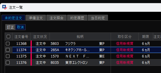 寄り付き直前、寄り前の板気配を見て、やっぱり全部取り消しました。チキンか!笑