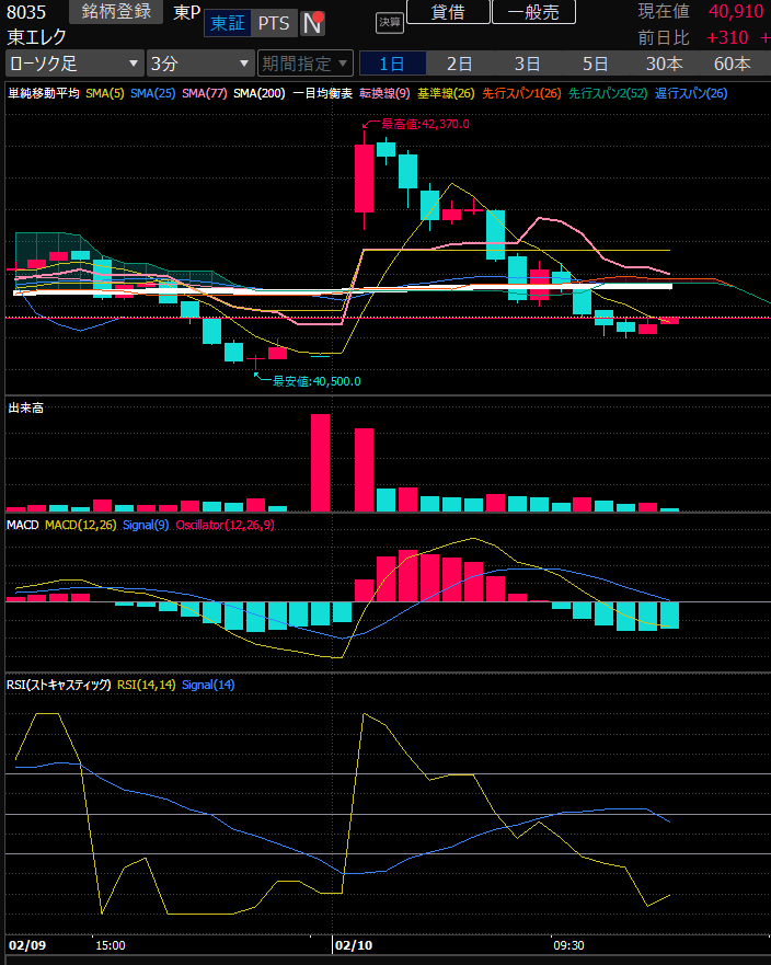 東京エレクトロンはここで入りました。最近は3分足を主軸に、3分→1分でチャートを見てから歩み値を眺めます。リバウンド取るときはRSIをチェックしてますしMACDも見ます。