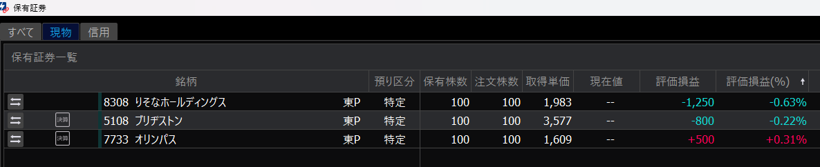 各100株です。スィングで取るつもりではなく、あくまで検証です。