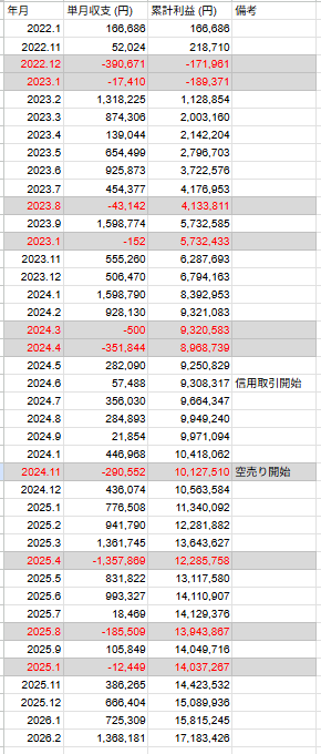2022年10月~2026年2月までの国内株(現物と信用)の実現損益