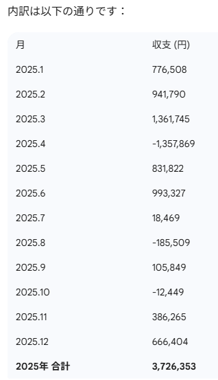 2025年(1月~12月)の単月収支