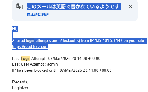 不正ログインを検知したらメールで連絡があるんですよ。IPアドレスも表示されます。