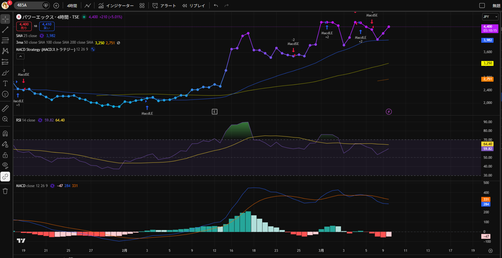 SBIでは4時間足表示ができないので、トレーディングビューを使って表示してみました。トレーディングビューは、ちょっと素人には難しいのですが、インジケーターをMACDストラテジーにして4時間足表示してみるとこんな感じに。
