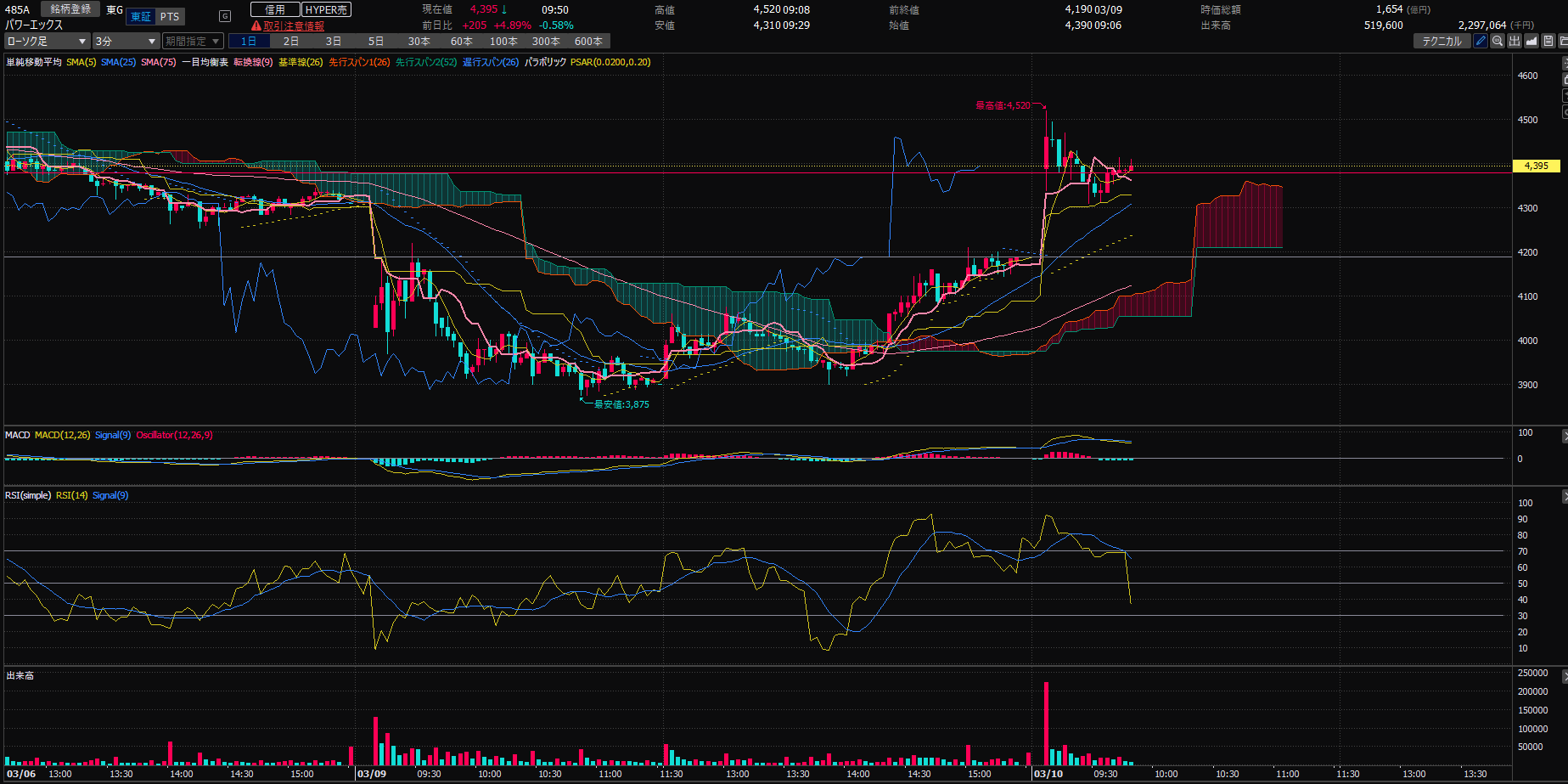 たとえば、485A パワーエックス。普段見ている3分足チャート。寄り付き30分だけのトレードなら、普段とおりやれば日に2~3万円取れると思うんですよ。