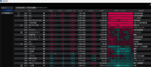 監視銘柄の一覧から、前日比がプラスで出来高が多く、VWAP比が高い銘柄を選定。