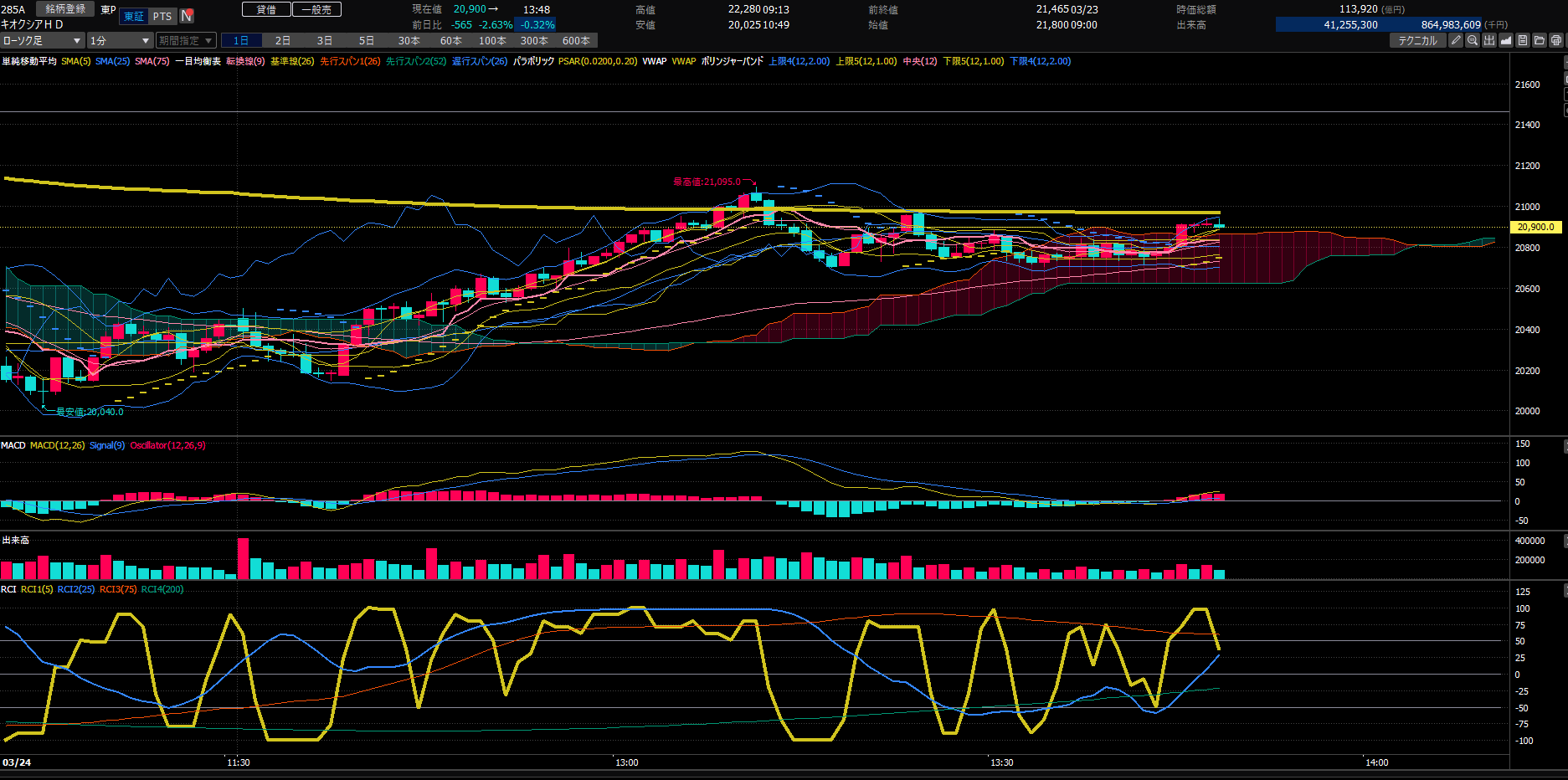 上部の黄色線はVWAP、下部の黄色はRCIです。