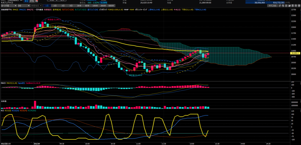 いつもは、移動平均線、一目均衡表、ボリンジャーバンド、MACD、出来高、RSIを表示させてトレードしています。