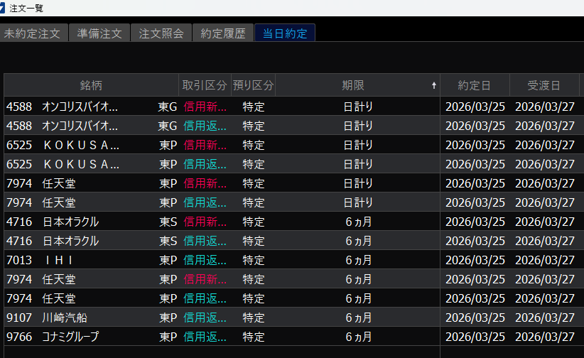 今日触った銘柄はこちら。IHIとコナミは前日からのスイング、コナミは損切りです。