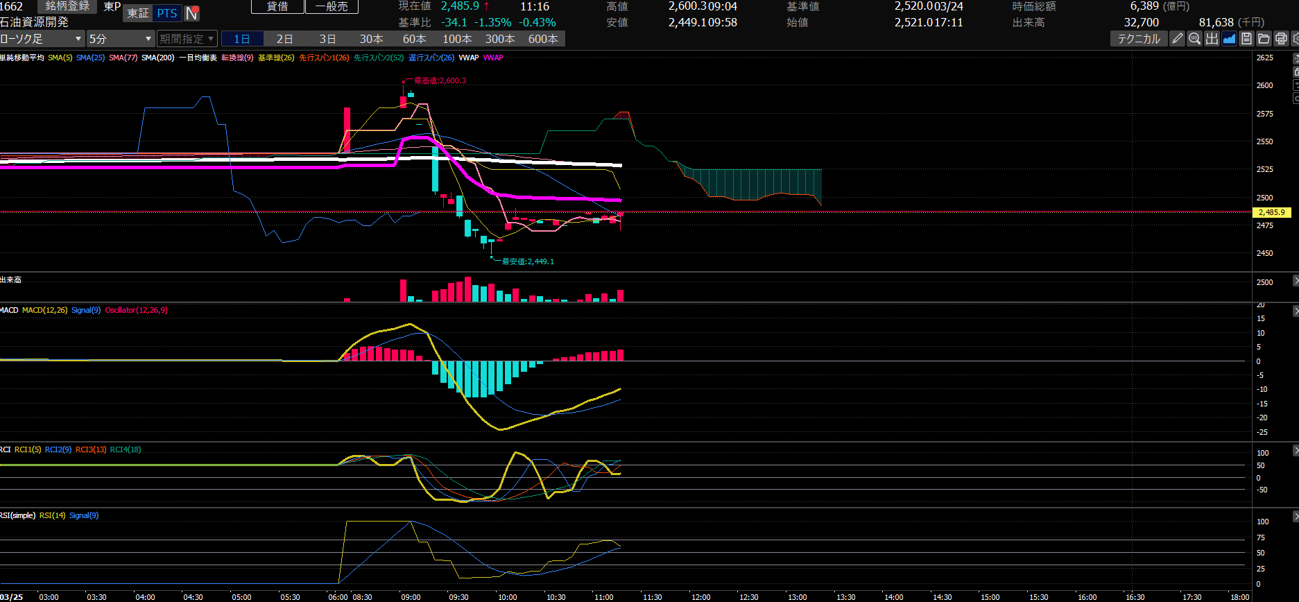 登録銘柄の中から、よく動いていてインジが良い銘柄で入りました。長らく、いつ面(半導体関連・東京エレクトロンやキオクシア)をどんな時も寄り付きでトレードするという癖から抜けられずにおりましたが、やっと銘柄選定から入るトレードに慣れてきました。