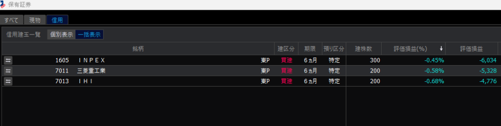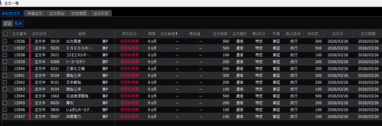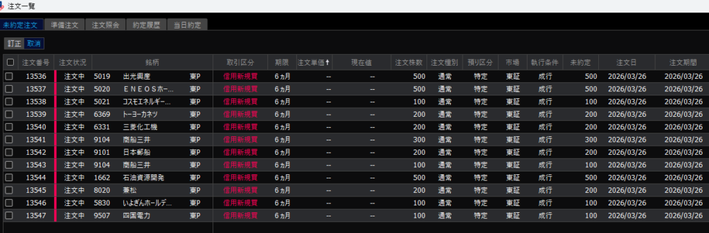 このキーワードから選定した銘柄はこちら。今日は外出する予定があるので、もしも下落スタートの場合を考え半年信用にしました。