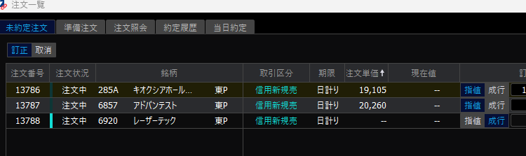 寄り付きショート、この設定したけど直前で取り消しました。寄り付いてからショート入りました。取れました。