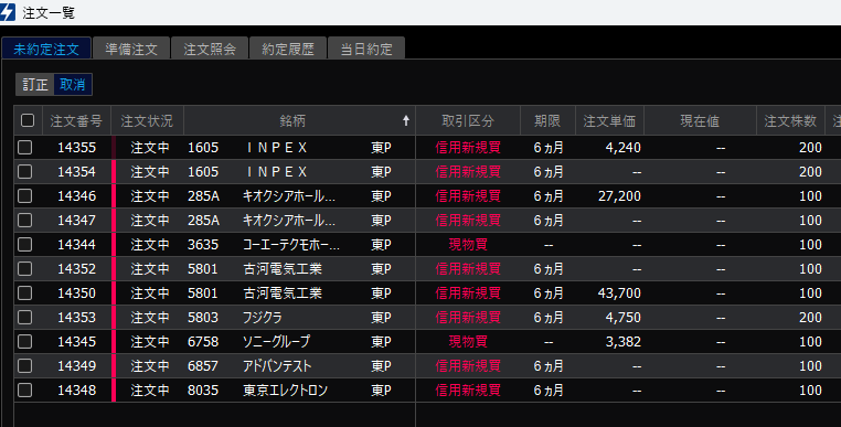 今日は寄り付き前に下記の注文を入れました。下げがキツすぎて戻りそうにない銘柄は即損切りすると決めてのことです。