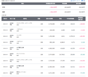 寄り付き直後。全ての銘柄がマイナススタート、いちばん下げた場面ではTOTAL30万ほどマイナスになりました。