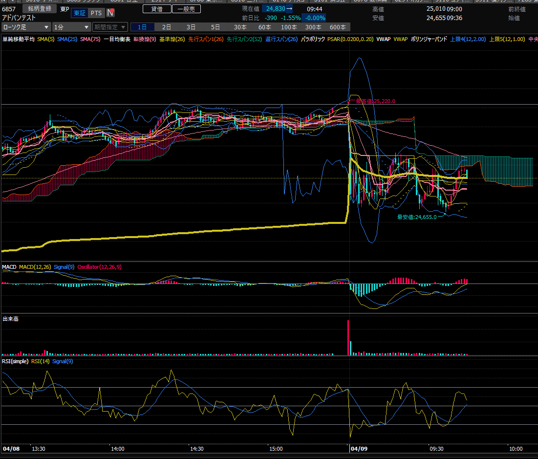 アドバンテスト、どんな感じかな?と見てみました。最安値:24,655円。ここで仕込めてたらなあ。