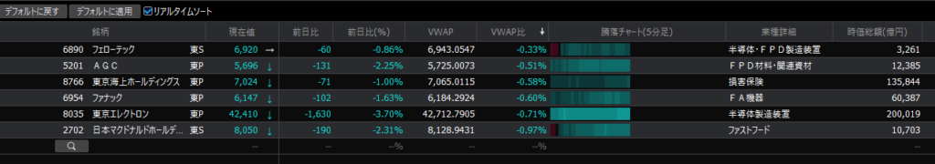 トライアル、フェローテック、ファナックは想定に反して下げています。