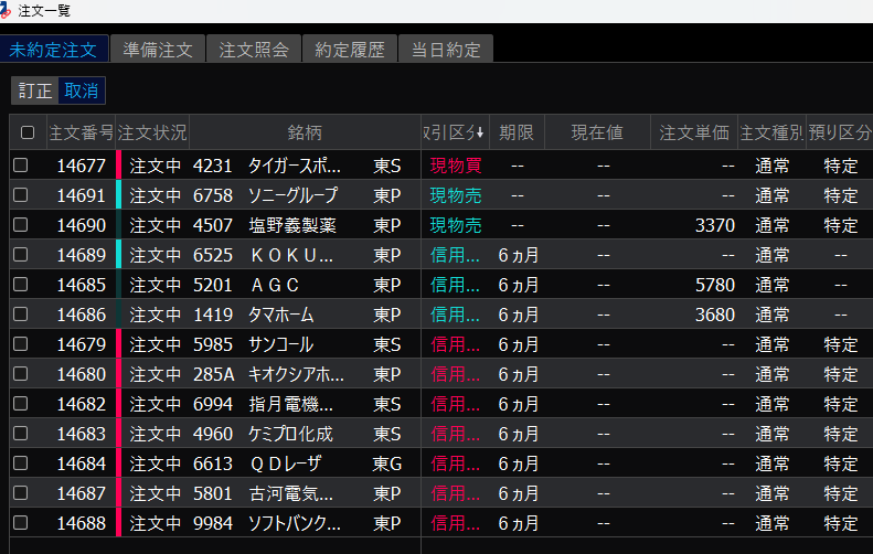 寄り付き前の注文はこちら。買ったもののスクリーニング後の精査で『割安でもなんでもないしキャピタル狙いでおいておくのもどうかな』と思った現物持ち銘柄を売却。