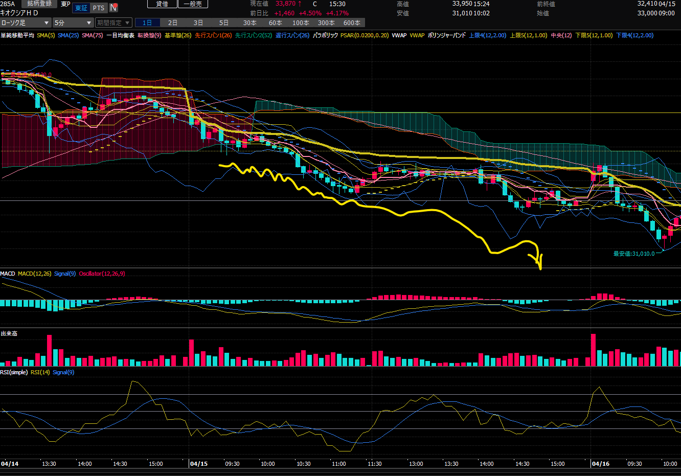 キオクシアのIFDの返済売指値が刺さらず、あれ??やばい。と思って1分足チャートに変えたら陰線でていました。