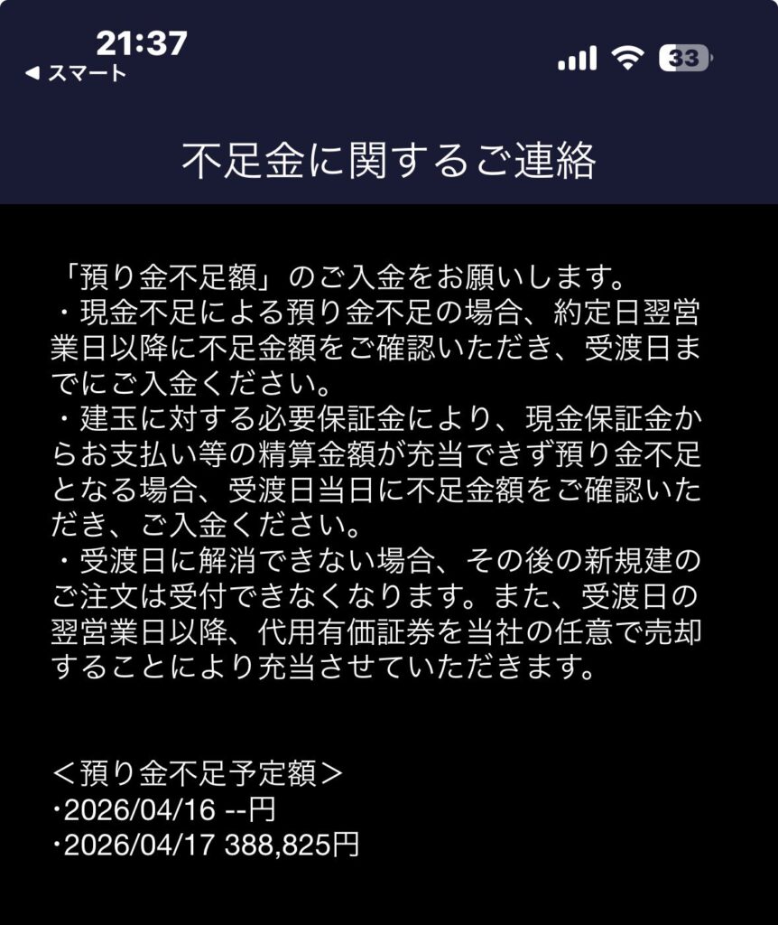 夜、SBI証券から『預り金不足』の通知がきて驚きました。